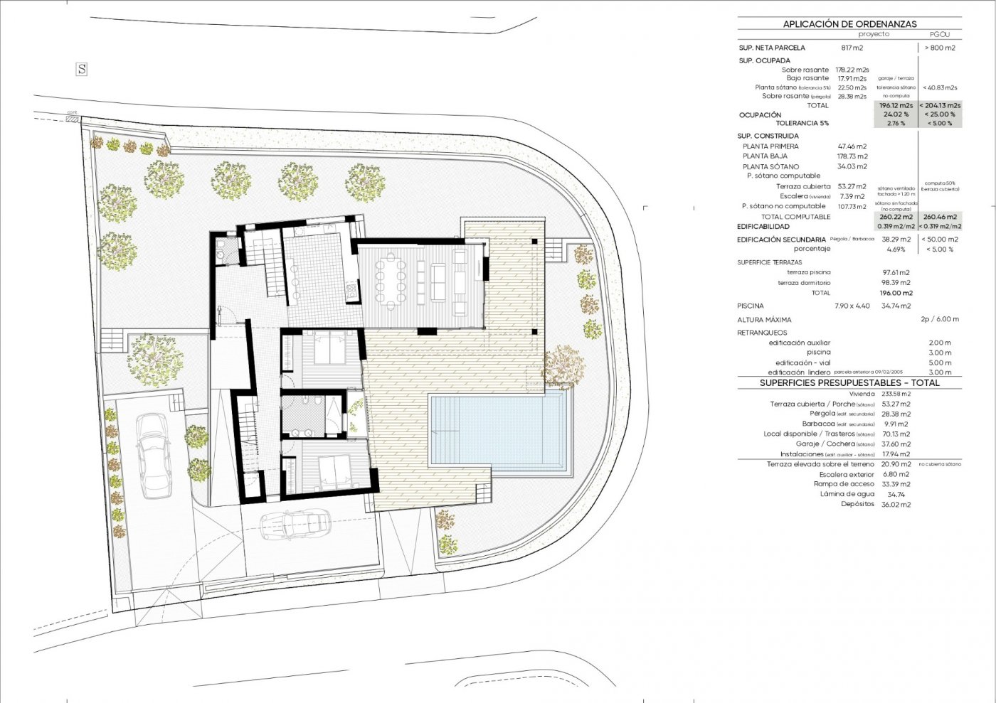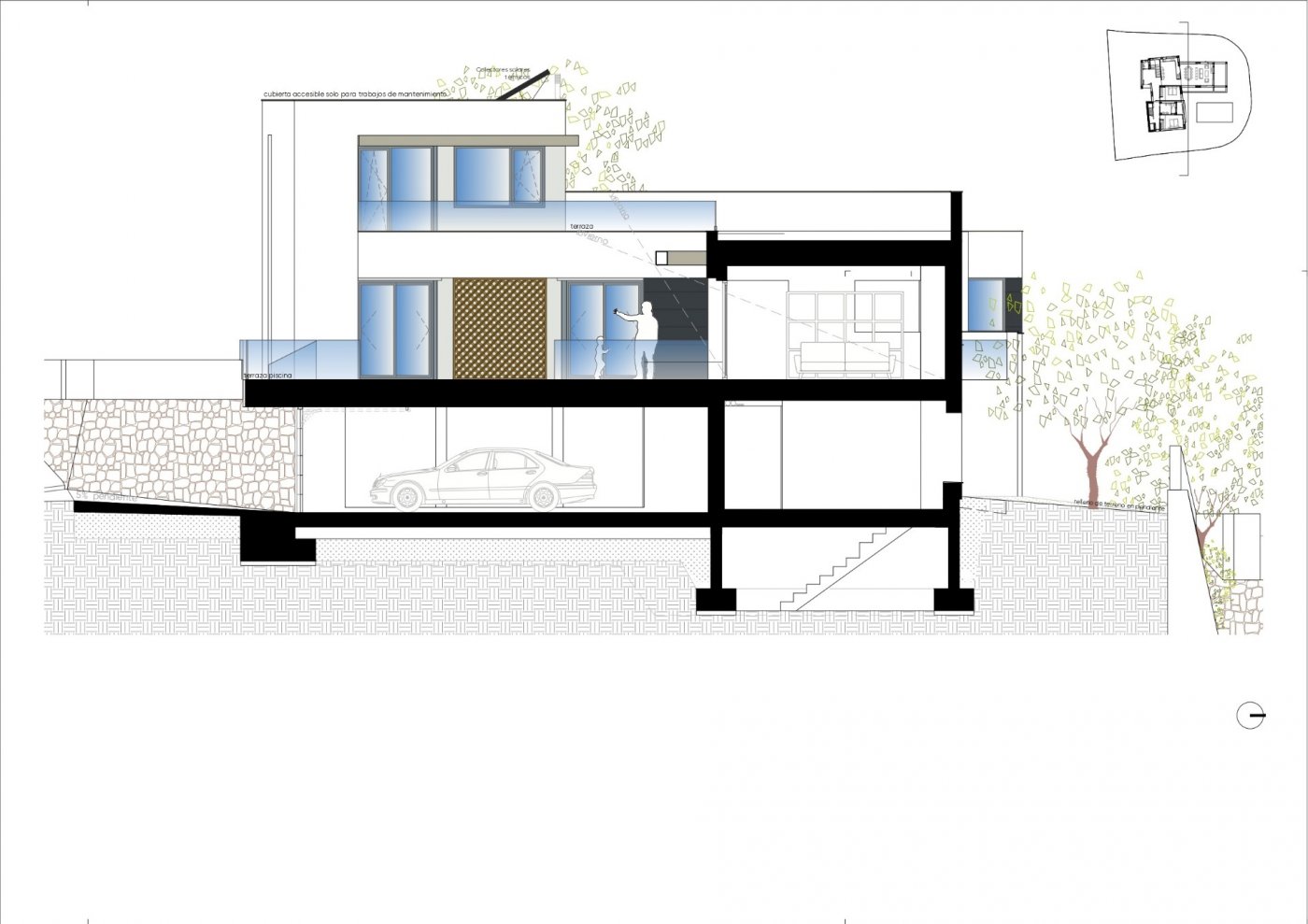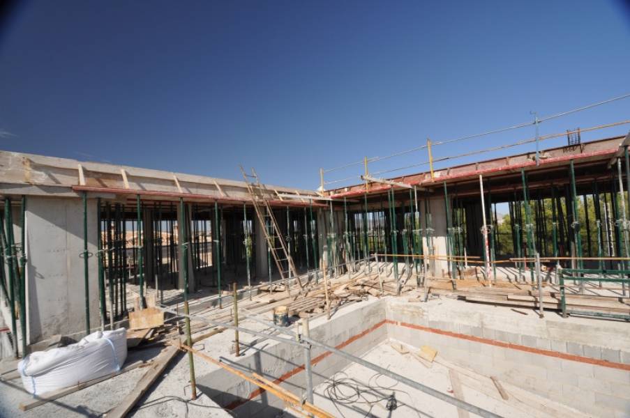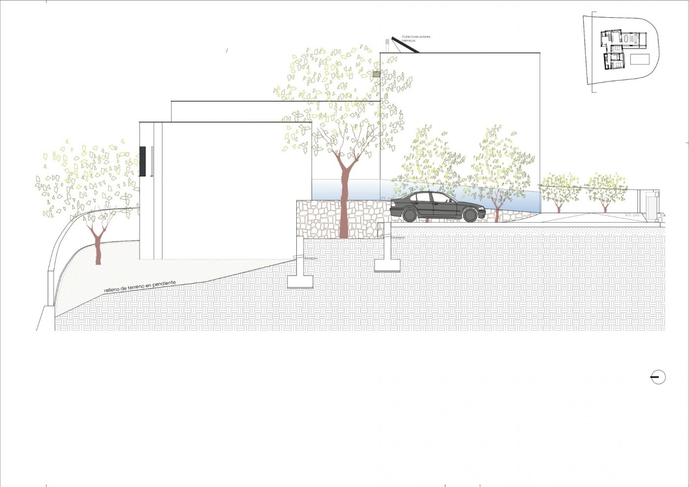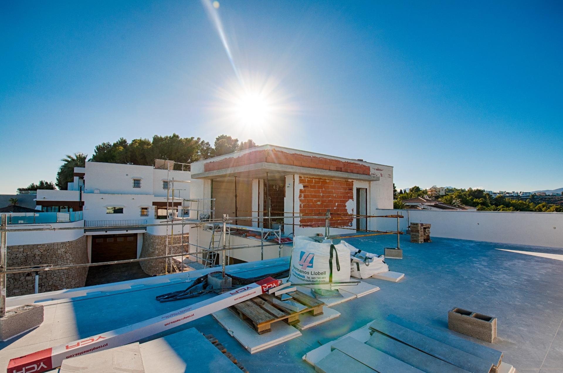 This villa consists of 4 floors. The main living floor has a spacious living/dining room with access to the pool terrace, a very large kitchen, two double bedrooms with built-in closets and access to the terrace; both bedrooms share a bathroom with walk-in shower. On this floor, there is also a guest toilet. On the second floor, you find the master bedroom with en suite bathroom, a walk-in closet, and access to a private sun terrace. Beneath the main living floor, there is a large under build with space to create another 3 (bed) rooms and where the garage is located. From here there are stairs down to the basement. Extras: several sun and covered terraces, 8m x 4m swimming pool, double glazing, underfloor heating, basement for storage and an off-road parking spot.