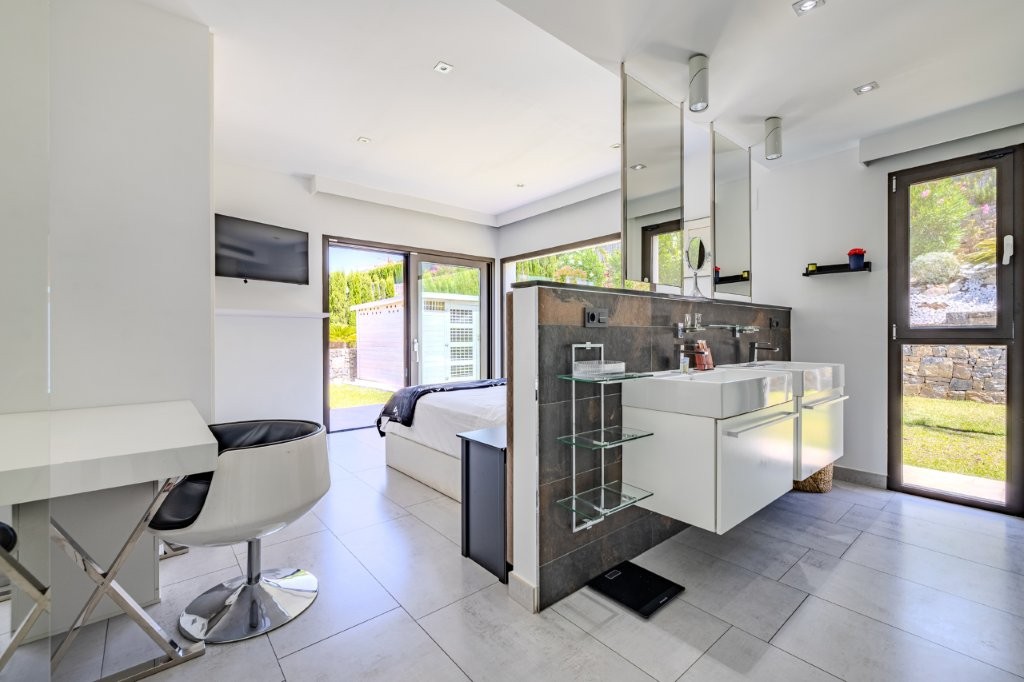 Javea Costa Blanca magnificent villa with sea view for sale, distributed over 3 levels with a total of 521m2 of designed living space, located in the prestigious area of Les Canselades, the villa has 5 luxury bedrooms all with own en-suite bathrooms, impressive open plan living room with both sea and mountain views, superior design fully equipped kitchen, upper level master bedroom suite, open plan office areas, lower level, bedroom with ensuite bathroom, spa with sauna, heated pool, gymnasium, Exterior: South facing with very private garden and pool area, Main pool + Infinity pool overlooking the garden also with sea views, Large pergola for alfresco dining, covered BBg kitchen area. Private parking for several cars, the plot is totally fenced and secure. Extras include: Three swimming pools, EV charger, Air conditioning, 18 kW solar plant with storage batteries KNX smart home system, Sonos sound system