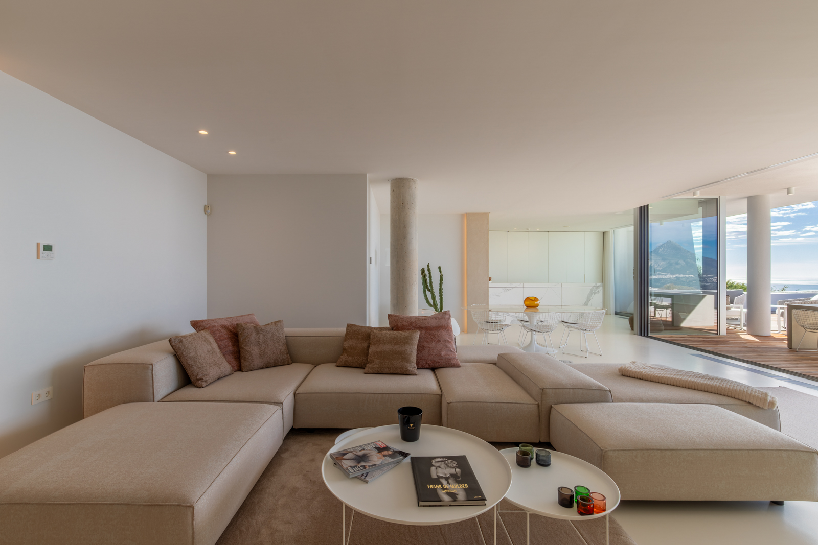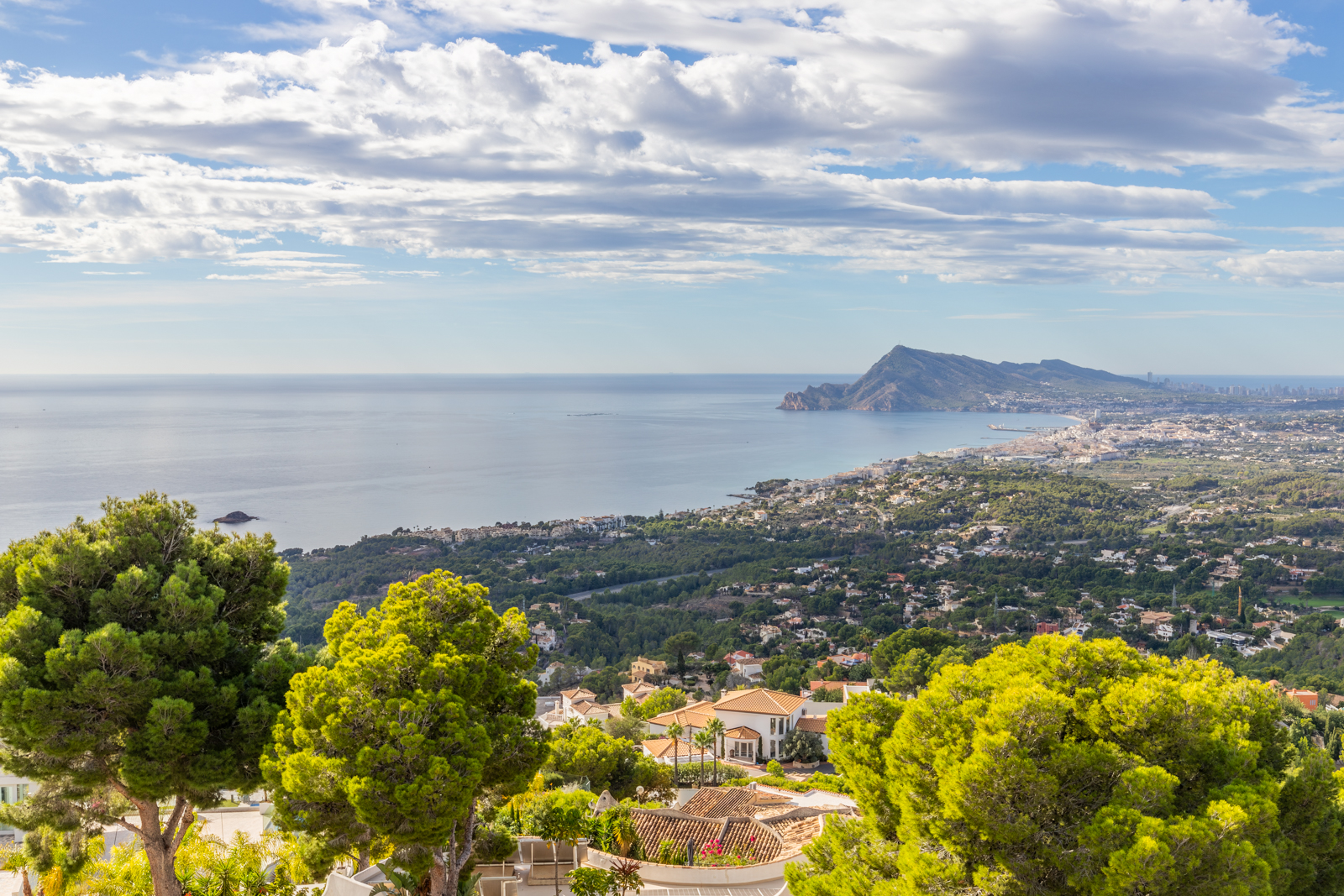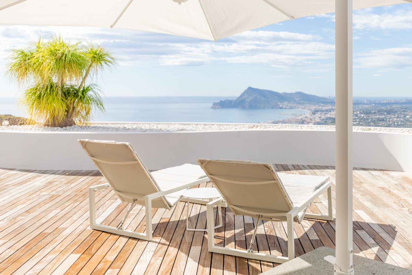 This exclusive penthouse combines the size of a villa with the convenience of an apartment. It offers style and comfort, and spectacular views of both the deep blue Mediterranean Sea and the impressive Sierra de Bernia. The focal point is the enormous, southwest-facing terrace of almost 250 m2, where you can enjoy the Mediterranean climate in peace and privacy year-round. Floor-to-ceiling sliding windows maximize natural light and offer breathtaking views from every room. The interior of this luxury home was designed by renowned Belgian interior designer Filip Deslee. It comprises a spacious living room, a modern, fully equipped kitchen with Miele appliances, a very spacious master bedroom with a dressing room and en-suite bathroom, and two additional bedrooms sharing a second bathroom. There is central air conditioning (hot/cold), underfloor heating in the bathrooms, home automation, a Sonos sound system, a fully equipped gym, a jacuzzi on the terrace, and a double garage and storage room of 73 m2. This exclusive residence on a 10,000 m2 plot features a fantastic communal swimming pool, a well-maintained garden, a fitness room and a 24-hour concierge.
