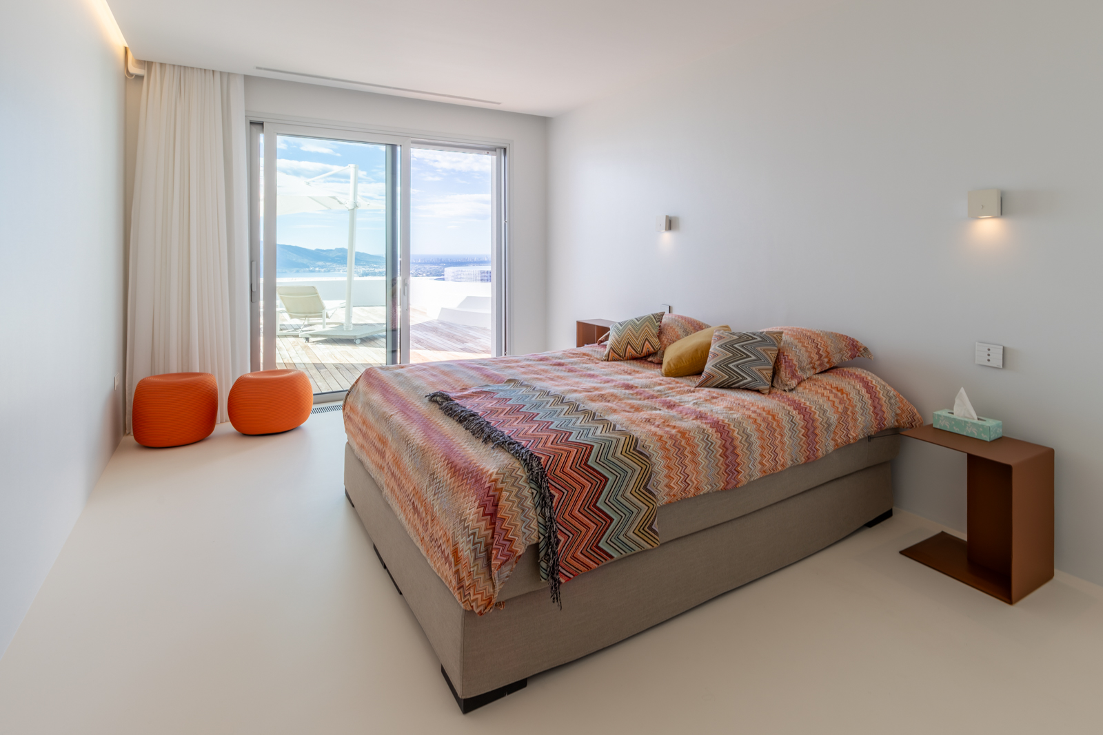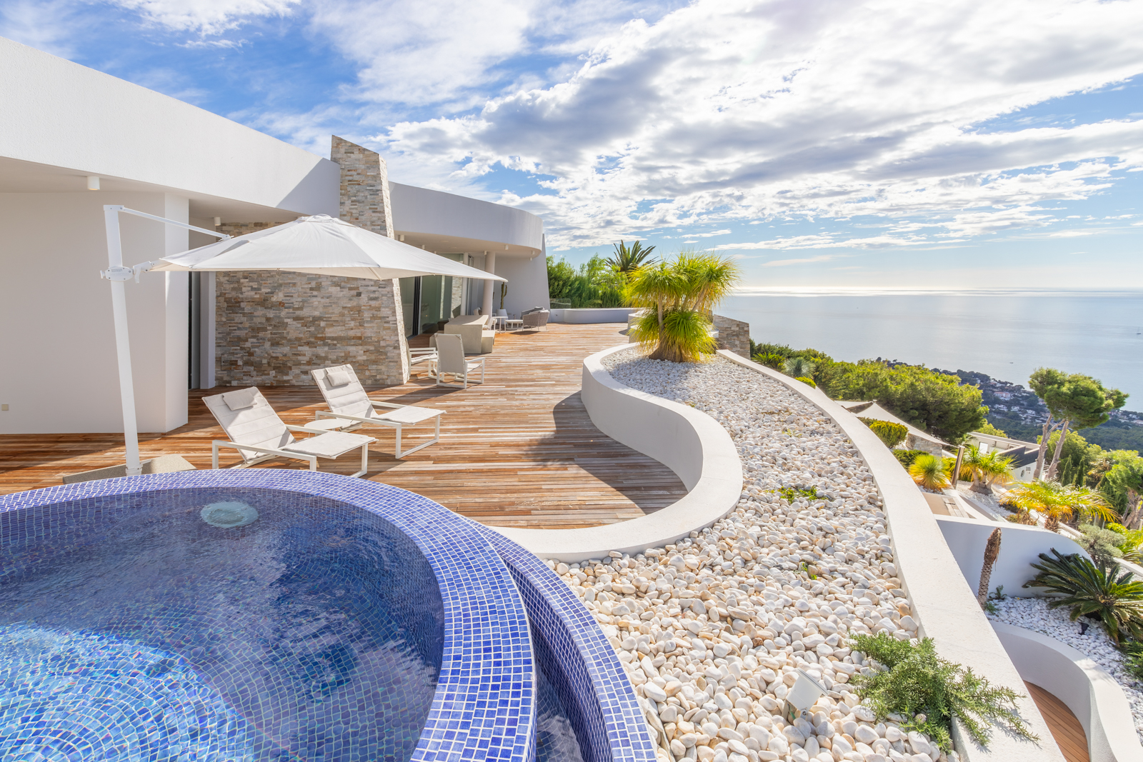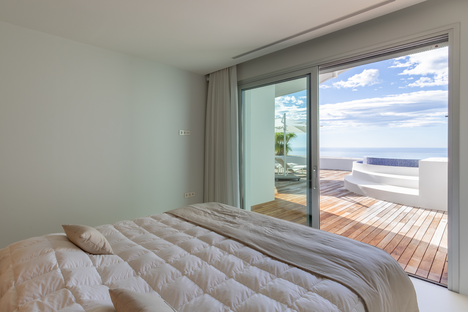 This exclusive penthouse combines the size of a villa with the convenience of an apartment. It offers style and comfort, and spectacular views of both the deep blue Mediterranean Sea and the impressive Sierra de Bernia. The focal point is the enormous, southwest-facing terrace of almost 250 m2, where you can enjoy the Mediterranean climate in peace and privacy year-round. Floor-to-ceiling sliding windows maximize natural light and offer breathtaking views from every room. The interior of this luxury home was designed by renowned Belgian interior designer Filip Deslee. It comprises a spacious living room, a modern, fully equipped kitchen with Miele appliances, a very spacious master bedroom with a dressing room and en-suite bathroom, and two additional bedrooms sharing a second bathroom. There is central air conditioning (hot/cold), underfloor heating in the bathrooms, home automation, a Sonos sound system, a fully equipped gym, a jacuzzi on the terrace, and a double garage and storage room of 73 m2. This exclusive residence on a 10,000 m2 plot features a fantastic communal swimming pool, a well-maintained garden, a fitness room and a 24-hour concierge.