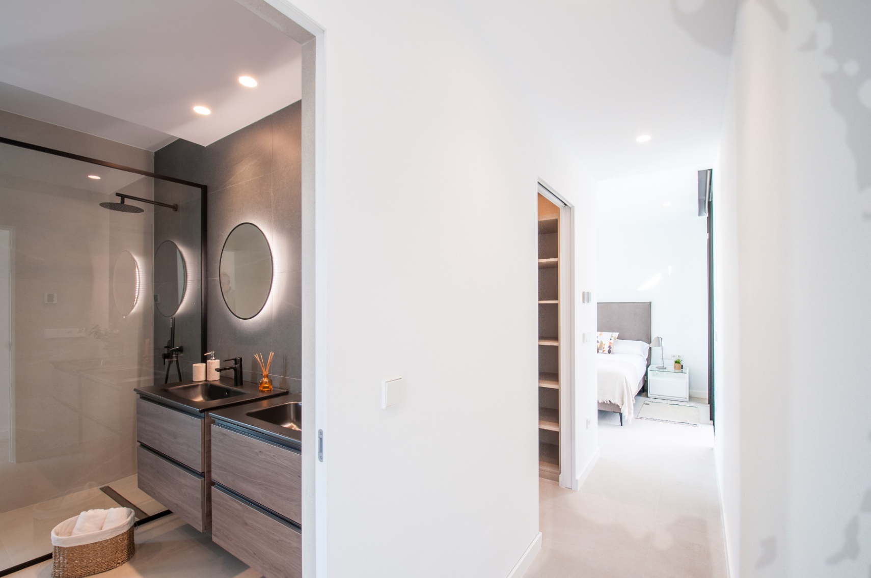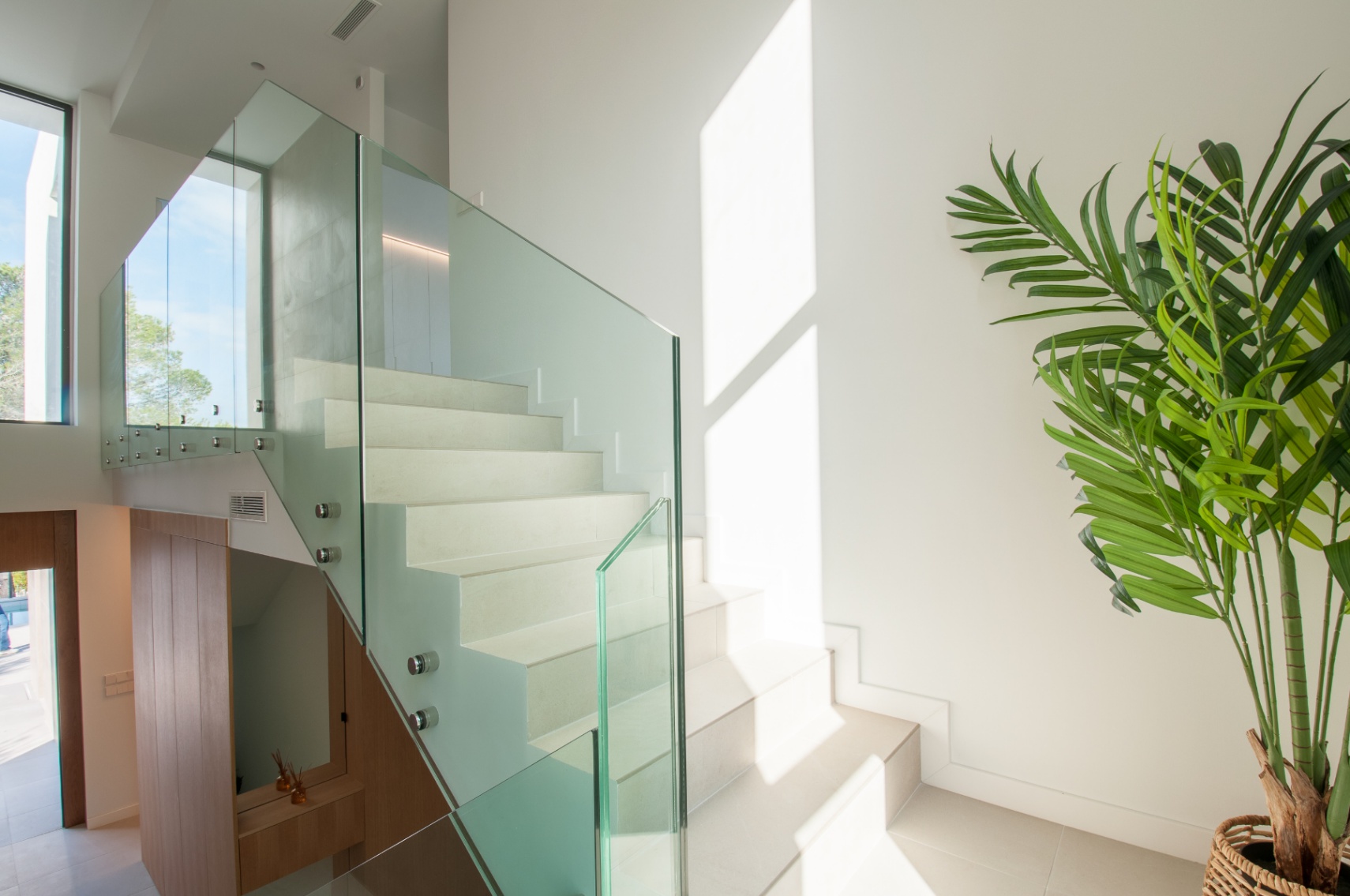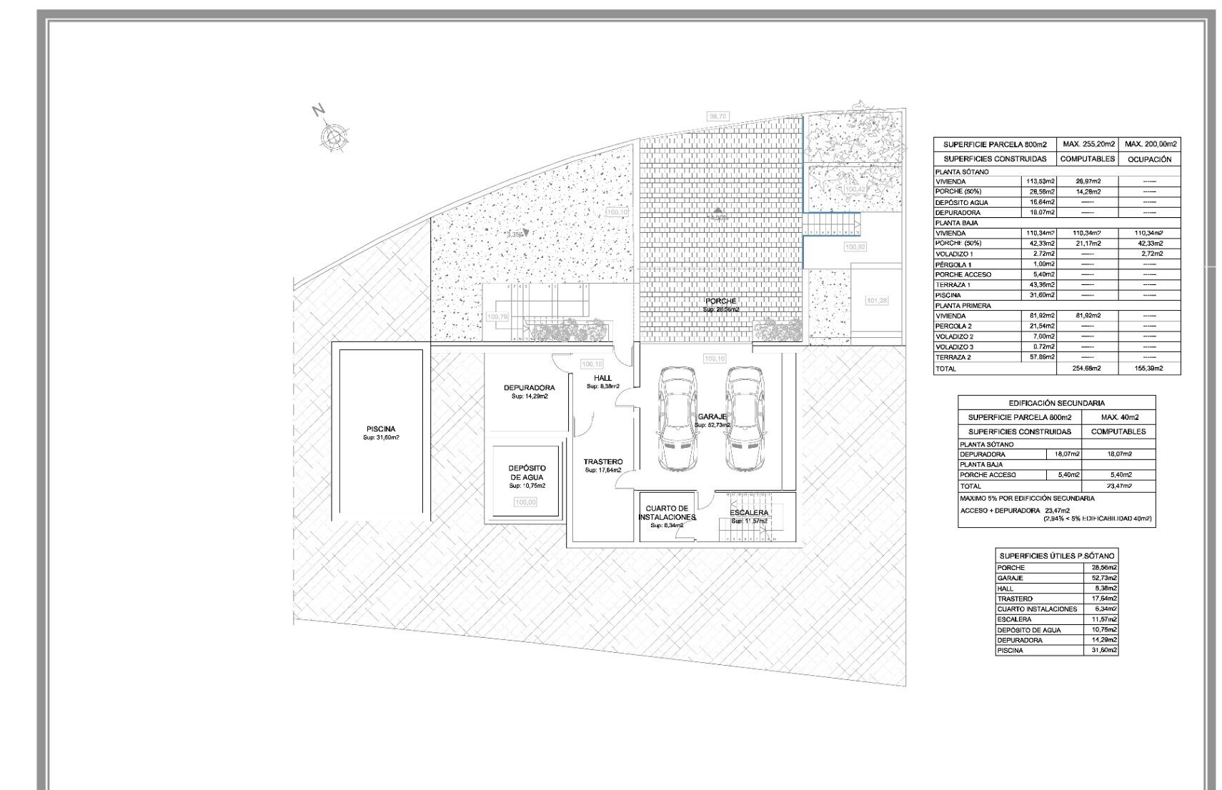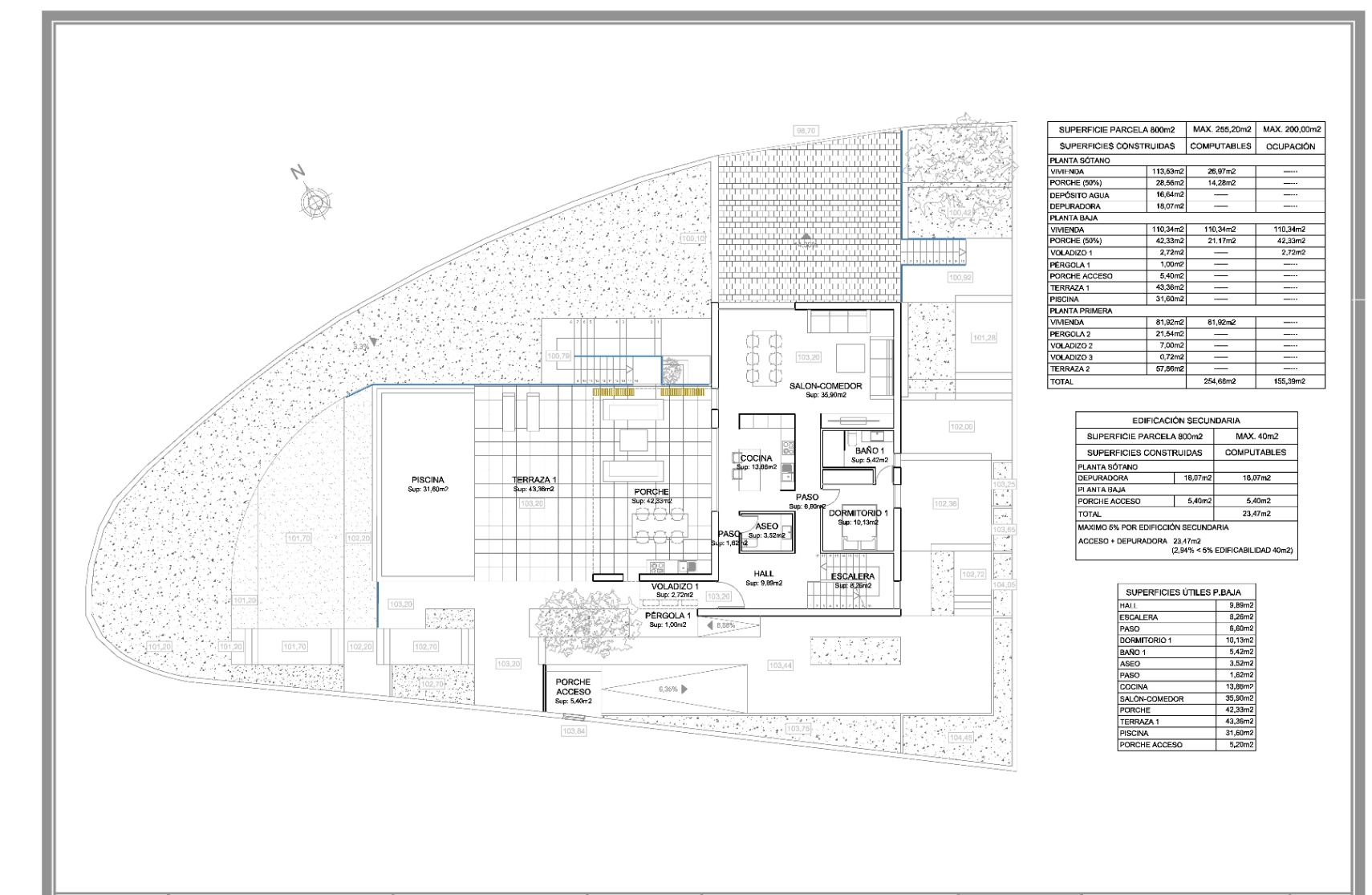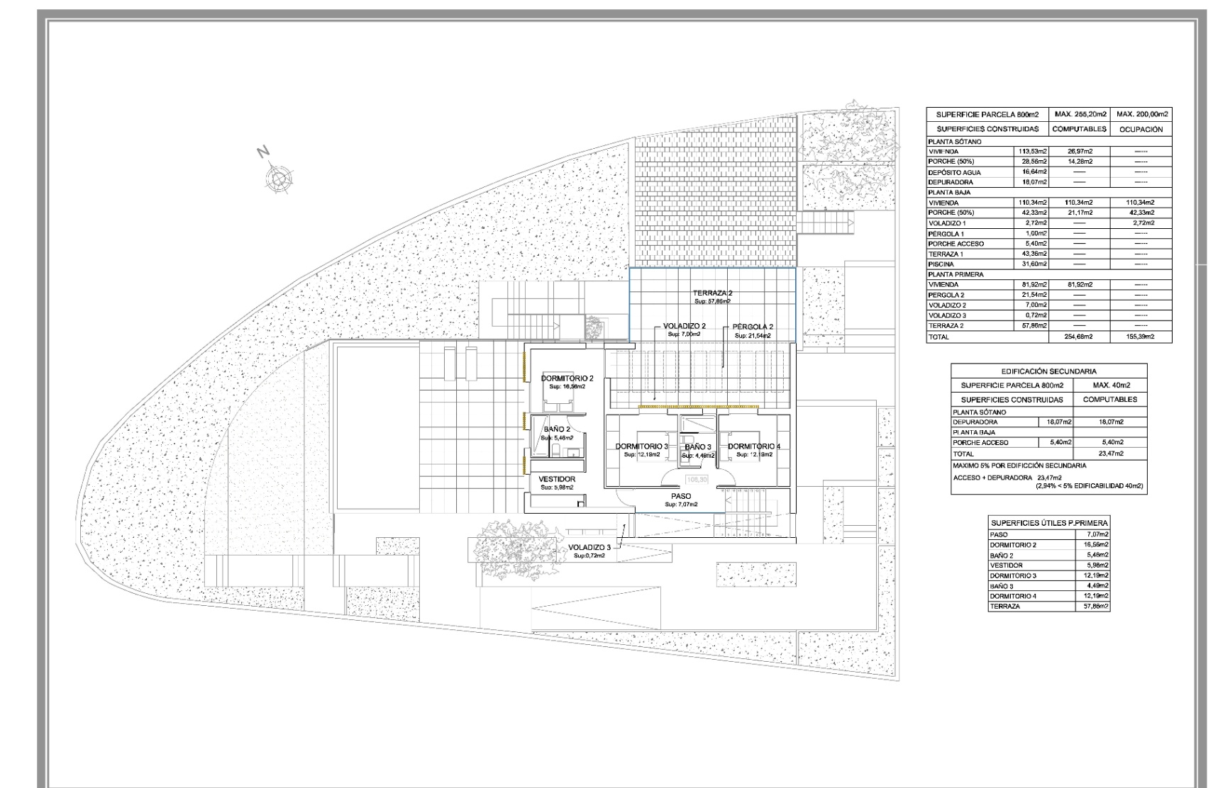 Located 4 km from Moraira and its beaches, this unique eco-friendly home is designed using local materials. The villa is spread over three levels. In the semi-basement, you’ll find parking for two vehicles, a storage room, an equipment room, and the vertical circulation core. On the ground floor, the living area includes an en-suite bedroom, an open-plan living room and kitchen, and a fantastic outdoor terrace with a pool. The terrace is surrounded by platforms with native vegetation from the area. Upstairs, there are three bedrooms, including one en-suite with a separate dressing room and a spacious terrace. The villa features flat gravel-finished roofs and high-quality black aluminum exterior carpentry with thermal break. The interior finishes are exceptional, with porcelain stoneware flooring throughout the house and terrace. The kitchen features marble countertops and oak melamine cabinetry, while the bathrooms include national brand porcelain tiling and high-quality fixtures. The property will also have an AEROTERMIA air conditioning system and underfloor heating or radiators throughout the house. Additionally, the plot will be enclosed with concrete walls and limestone masonry, featuring a covered pedestrian entrance and a motorized vehicle gate.